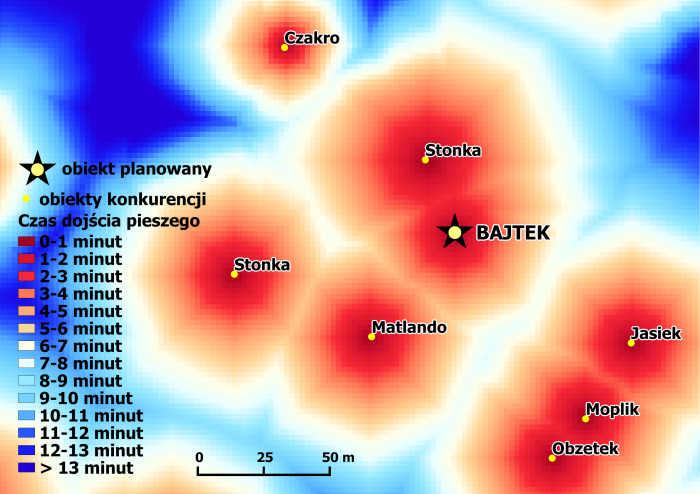 Pozwala na określenie czasu dojścia do Nas i do konkurencji – do kogo klienci mają bliżej, z kim konkurujemy w strefie podobnego czasu dojścia, gdzie występuje kanibalizacja Naszych usług i usług konkurencji. W toku dalszych analiz pozwala na pozwala na określenie stopnia zamożności każdej strefy czasowej. Ponadto w powiązaniu z Modelem Huff’a pozwala na określenie liczby konsumentów w każdej strefie czasowej, która prawdopodobnie przemieści się do danego obiektu w celu skorzystanie z jego usług/zakupu towarów.